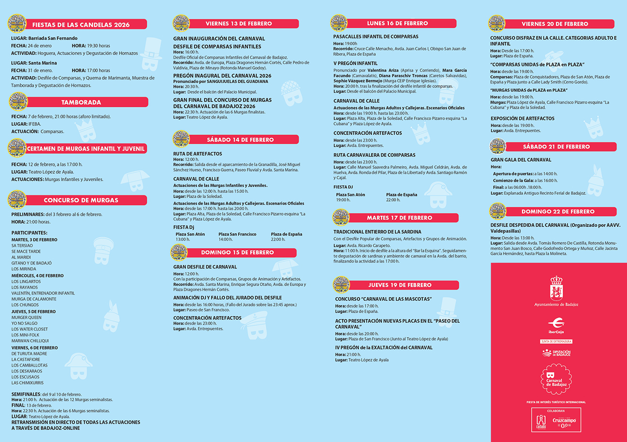 El concejal delegado de Ferias y Fiestas, José Antonio Casablanca, ha dado a conocer el calendario de esta edición, que se celebrará del 13 al 22 de febrero, incluyendo actividades previas como Las Candelas de la Margen Derecha (celebradas el pasado fin de semana) y Santa Marina (del 29 al 31 de enero),. El martes 3 de febrero comenzará el COMBA (Concurso Oficial de Murgas de Badajoz) en el Teatro López de Ayala: preliminares del 3 al 6 de febrero, semifinales los días 9 y 10; el COMBITA (concurso de murgas infantiles y
