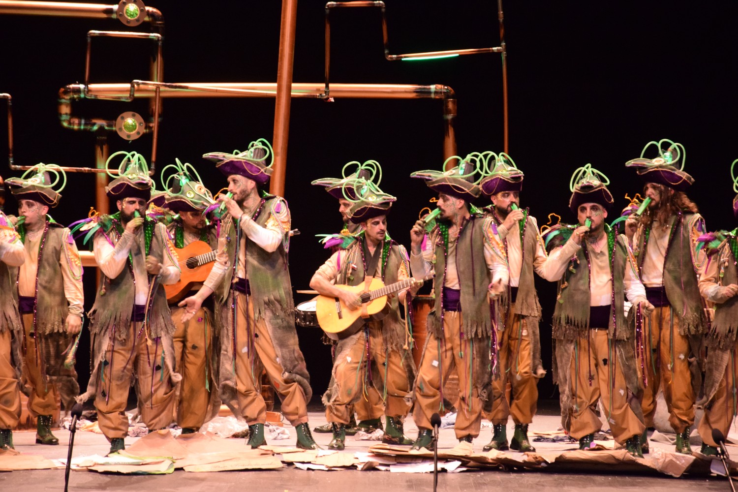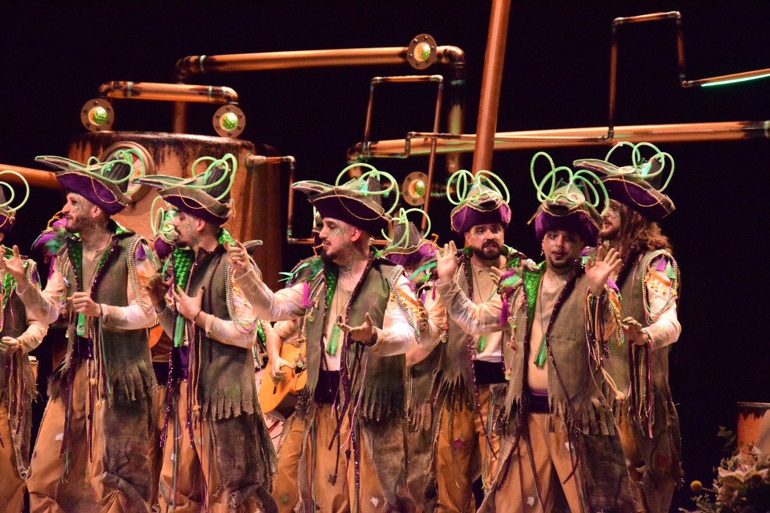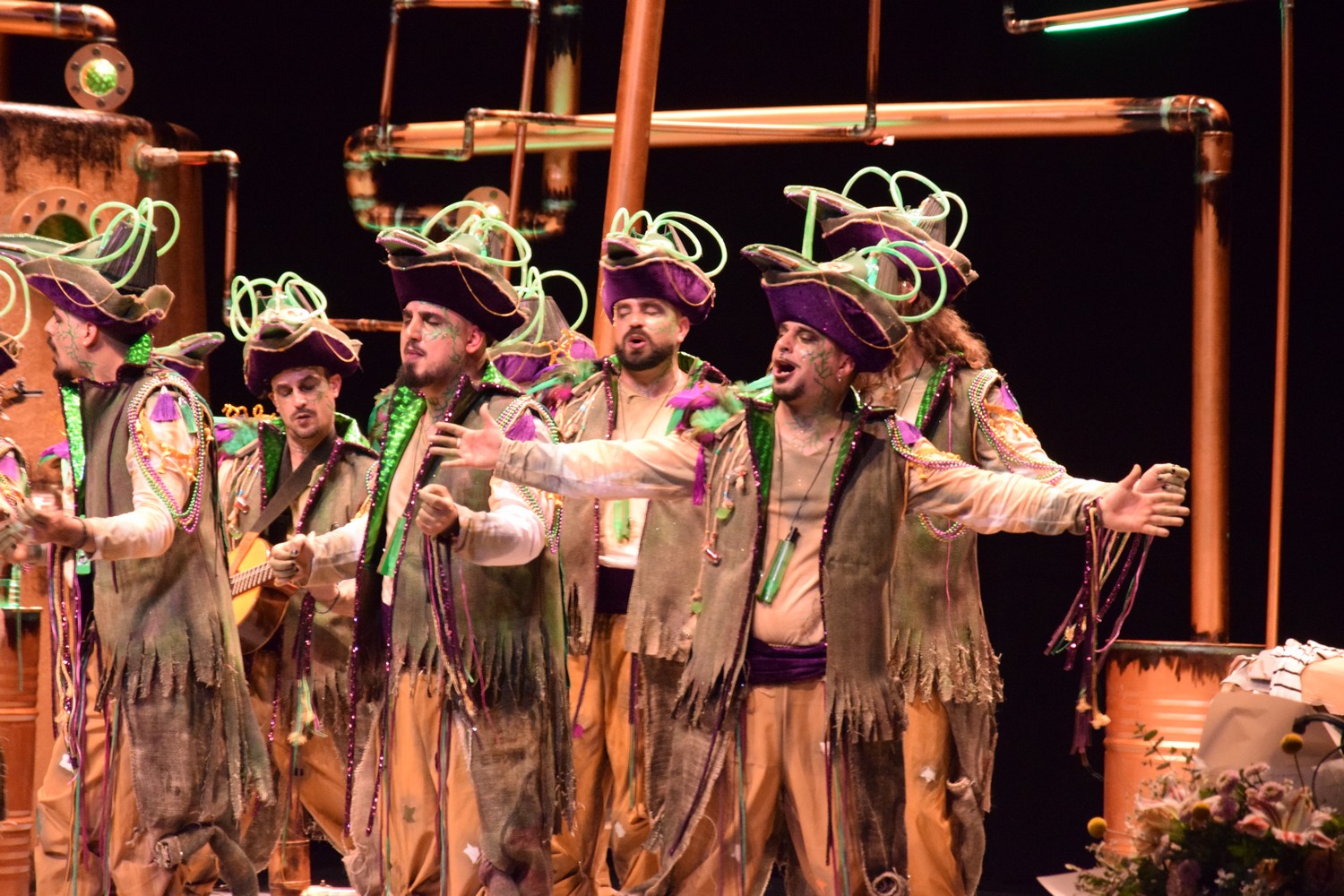 Luces verdes en un escenario a oscuras, y comienzo en el que suenan unas congas. Se ilumina el escenario y disfraz de…¿piratas? Que traen veneno del carnaval. Escenario que nos recuerda una instalación de salmuera de una cervecería (qué bien nos vendría una, con el calor que hace en el López). Si algo queda claro es que nos traen veneno de Carnaval. Primer pasodoble para recordar su etapa infantil y los castillos de arena elaborados junto a su padre, y cómo se los llevaban las olas, junto con sus ilusiones, lo que aprovechan para tirar una analogía con los medios más duros a su juicio con los murgueros. Segundo pasodoble al bullyng. Nada nuevo bajo el sol, temas muy cantados en el López, de momento, cuatro pasodobles serios. ¿Estamos en Carnaval? A ver si en los cuples lo notamos. Primero para cantarle al jurado y criticar su resultado del año pasado. Pues tampoco lo notamos. Segundo cuplé a la fiebre que hay en España por las artes marciales y remate sobre un vídeo que ciruculó en redes y que preferimos no comentar. Vamos al popurrí: primera mención al basurazo. Estrofa larga al alcalde, que creo llega con un par de años de retraso por la temática elegida (sobre la designación de Gragera como candidato por el PP al Ayuntamiento). Murga que elije un estilo crítico, que no llega a ser contundente. Vale, está bien eso de ser ácidos, pero seguimos echando de menos unas risas, y ya van dos murgas.