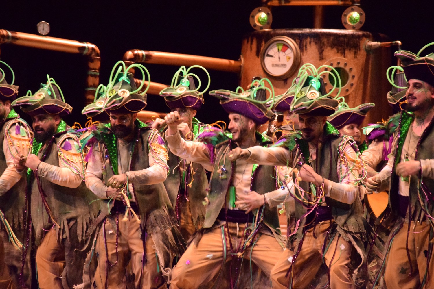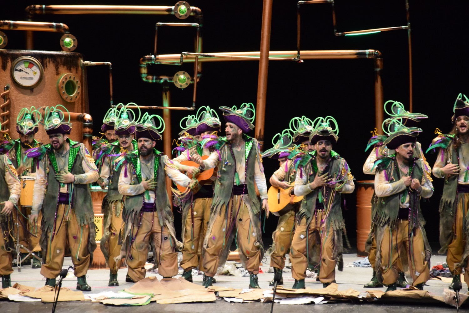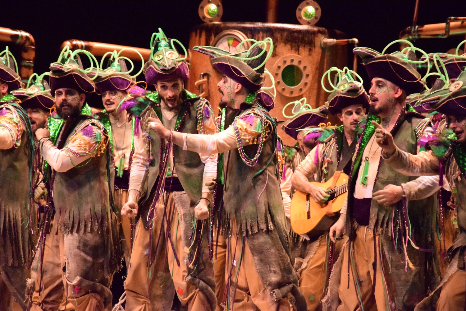 Luces verdes en un escenario a oscuras, y comienzo en el que suenan unas congas. Se ilumina el escenario y disfraz de…¿piratas? Que traen veneno del carnaval. Escenario que nos recuerda una instalación de salmuera de una cervecería (qué bien nos vendría una, con el calor que hace en el López). Si algo queda claro es que nos traen veneno de Carnaval. Primer pasodoble para recordar su etapa infantil y los castillos de arena elaborados junto a su padre, y cómo se los llevaban las olas, junto con sus ilusiones, lo que aprovechan para tirar una analogía con los medios más duros a su juicio con los murgueros. Segundo pasodoble al bullyng. Nada nuevo bajo el sol, temas muy cantados en el López, de momento, cuatro pasodobles serios. ¿Estamos en Carnaval? A ver si en los cuples lo notamos. Primero para cantarle al jurado y criticar su resultado del año pasado. Pues tampoco lo notamos. Segundo cuplé a la fiebre que hay en España por las artes marciales y remate sobre un vídeo que ciruculó en redes y que preferimos no comentar. Vamos al popurrí: primera mención al basurazo. Estrofa larga al alcalde, que creo llega con un par de años de retraso por la temática elegida (sobre la designación de Gragera como candidato por el PP al Ayuntamiento). Murga que elije un estilo crítico, que no llega a ser contundente. Vale, está bien eso de ser ácidos, pero seguimos echando de menos unas risas, y ya van dos murgas.