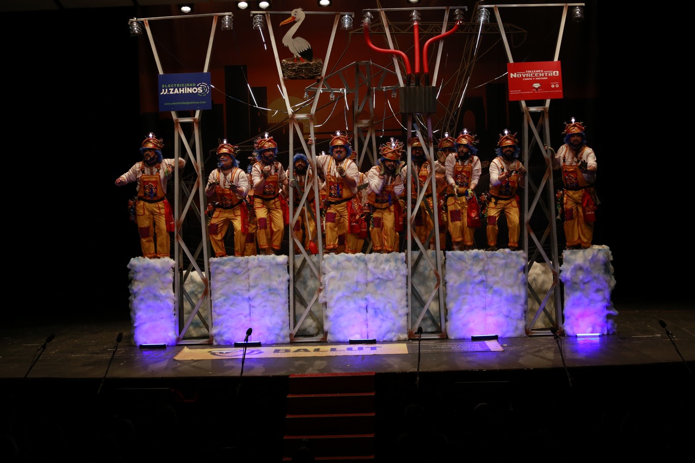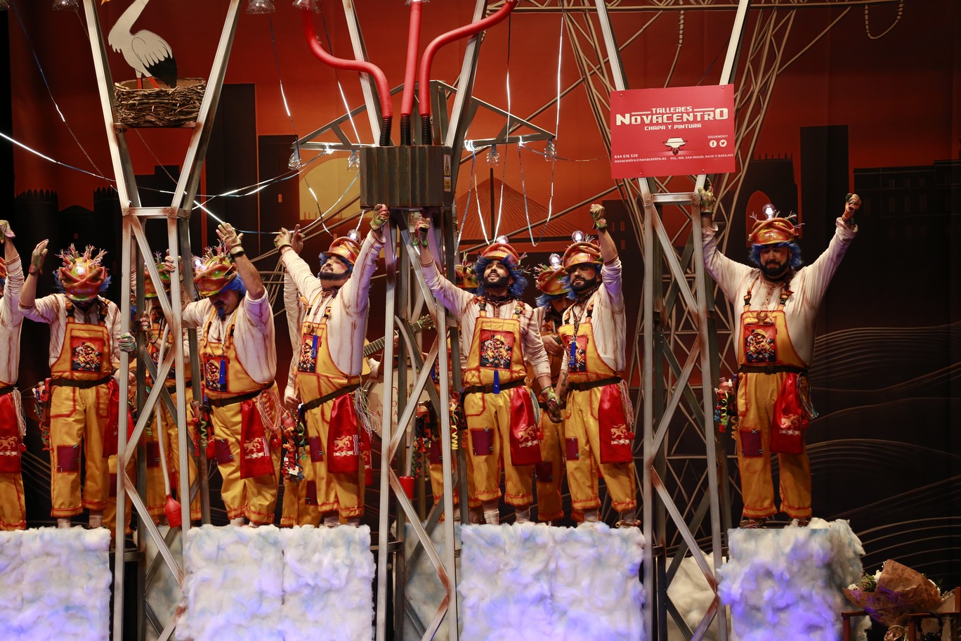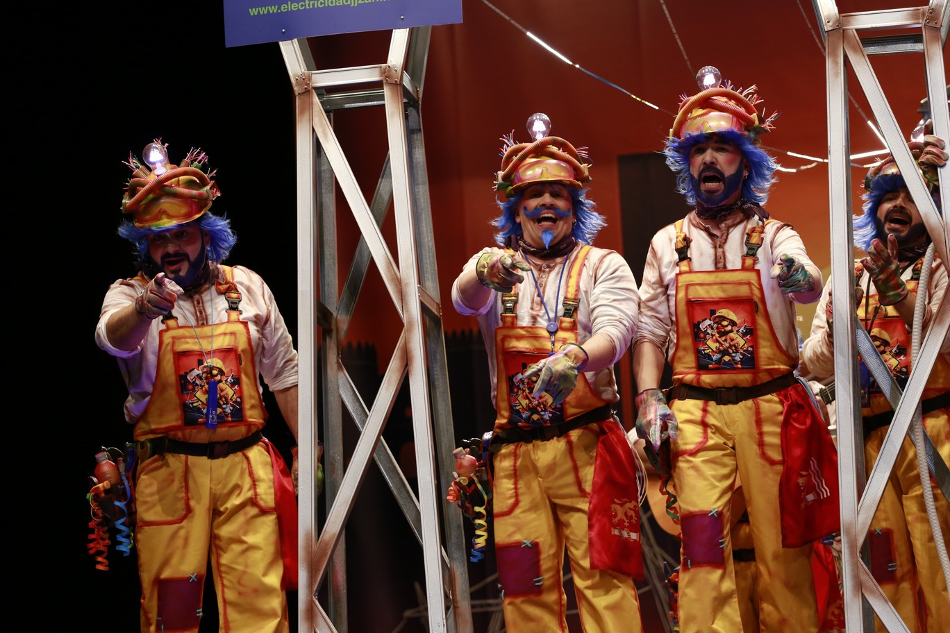La última murga de la noche comienza su actuación a las 00:10 horas. Son Los Mirinda, quienes dedican su actuación a María, quien mañana tiene una operación delicada en Madrid. Son electricistas, pero de los que se suben a las torretas para reparar cables de alta tensión. Y como no, el apagón. Y el derrumbe en la muralla, junto a Espantaperros. Y expertos en enchufes, los del Ayuntamiento y Diputación. Cantan desde las altura, lo que nos recuerda el año de infieles, en el que cantaron desde la cornisa. Primer pasodoble, piropo a Badajoz, “la que canta para olvidar, la que sueña con comparsas”. Y cierre con crítica a Gragera.Segundo pasodoble, para Toni la regidora, persona muy querida por todos los murgueros. Y se nota en sus repertorios. Vamos con cuplés. El apagón, y los kits de supervivencia. En el de Badajoz faltan migas, cachuela… Popurrí, con el expresso machiato,