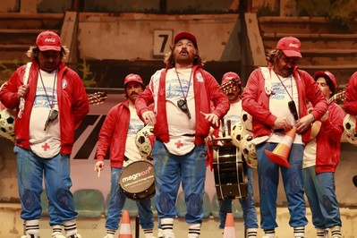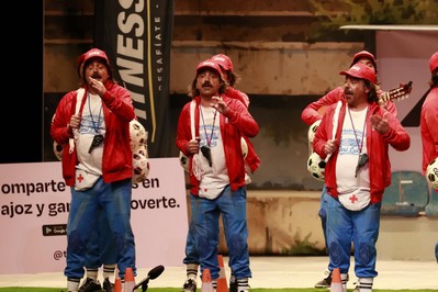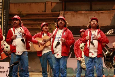 extraño que el muñeco se pierda, porque las alcantarillas están llenas de mierda. Primeros pasodobles humorísticos del COMBA. Cuplés, que empiezan como cántico de hinchada de fútbol. El primero lo rematan con un baño conjunto en una piscina Toi. El segundo para la amenaza de bomba en Diputación, que no afectó a nadie porque fue a las dos menos veinte, y ya no había nadie trabajando. Popurrí, en el que aparece la baliza, juego de palabras para identificar a los equipos de niños pijos como el Rayo Cayetano. También puntazo con el minuto de silencio por la muerte de su socio más antiguo, Raimundo. Al final, lo dejan en treinta segundos. Gran actuación de los entrenadores que nos llevan al descanso.
