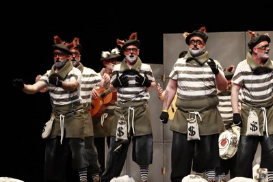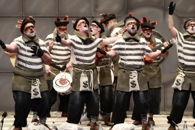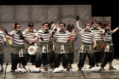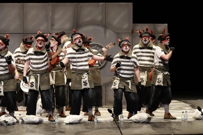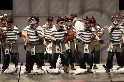 Hace su debut en las tablas del López de Ayala la murga de Calamonte, Los Cacos. Presidiarios de los de toda la vida, con camiseta a rayas blancas y negras. Cuatro guitarras, algo no usual en Badajoz, dos contraltos en primera fila y sonido acomparsado, que es la modalidad bajo la que concursan en Mérida, donde el certamen se desdobla en más categorías que en Badajoz. Buena puesta en escena. Soy un bandido, un delincuente, que roba en el mundo entero. Vamos a los pasodobles, el primero para las violaciones. El segundo, para las madres. En los cuplés, tercera coincidencia de la noche, a la hora de cantar al paquete bomba de Diputación. Popurrí, que abren diciendo que el Congreso está lleno de rateros. Llamadas a cambiar la sociedad para eliminar la homofobia.En esta región, ser ladrón es un regalo de profesión. Y canto enamorado a Extremadura. Y al fondo, el figurante, con brazos cruzados, que baila moviendo tan sólo la cabeza. Buen debut para esta murga que viene desde la comarca de Mérida.