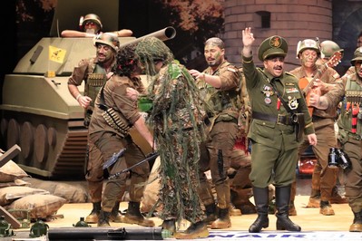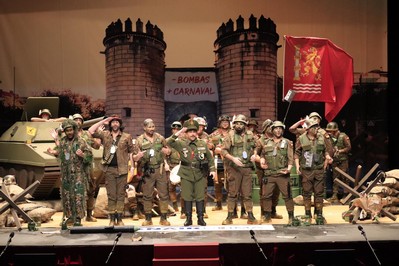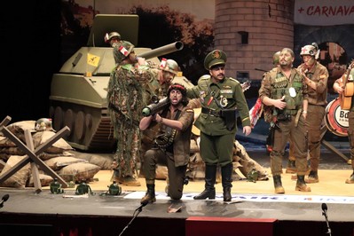 Trajes de militares, tanques, fusiles, y al fondo la bandera de Badajoz. Ejército cani, ejército de Badajoz, que llega para defendernos de los rusos, si nos invaden. El general, Pucherete junior, será el eje cómico de la murga, creo.