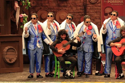 En los cuplés, la murga se soltó la flor al ojal. La historia de las gafas rojas que desvirtúan los colores y hacen que no se vea el naranja… con la mujer del alcalde poniéndoselas para no ver a Gragera el fin de semana. Risas, incluidas las del propio alcalde, que también cuenta. De nuevo, cameo de Jesús Ortega, bailando sobre el tablao, y Guibe arrancándose por fandangos para cantarle a Badajoz y a ese ambiente tan nuestro de febrero.
