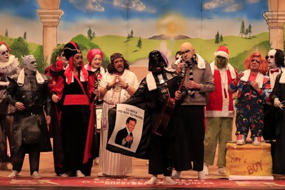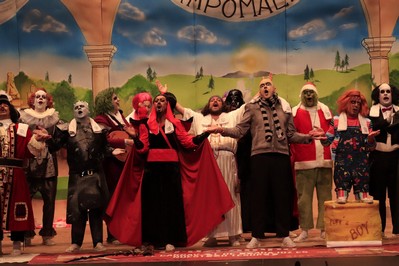 Hoy, segundo día de semifinales, empezamos malamente. Con 18 minutos de retraso, por alguna incidencia de Canal Extremadura. Lorido lo explica, y en la sauna del López de Ayala (madre mía, qué calor), entendemos el porqué del retraso. Lo que no se retrasa es la voz de Lori para presentar, a lo grande, a Yo no salgo. Y meten letra tan fresca como el problema de sonido que acabamos de comentar. Los villanos de toda la vida, que se vienen a rehabilitar. Primer pasodoble, cuando un genio se va, deja una calle vacía. Ese genio se llama Robe Iniesta. Segundo pasodoble para los recortes en sanidad, mejor dicho: para quienes los aplican, que nunca acaban bajo tierra los primeros. En los cuplés, el primero para la proliferación de locales de comida japoneses, cierre con coña con el alcalde (que se parece a Chucky). El segundo, para el tiempo en Badajoz, que últimamente está siempre lloviendo. Y abren