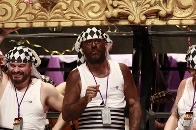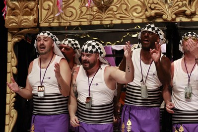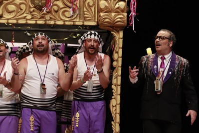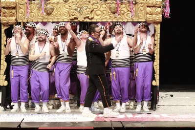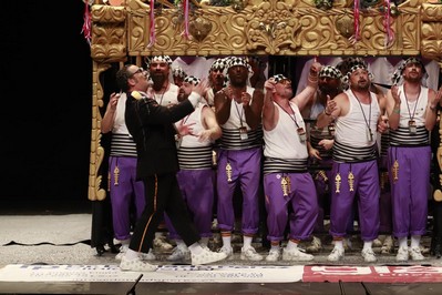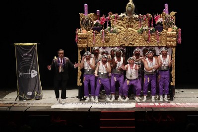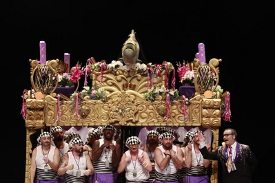 Los Water Closet aparecen bajo el paso. Víctor, con detalles magníficos en el traje como la cera derretida sobre sus hombros. Sansinena ha agudizado el color de su piel para esta final, y lo comenta con Juanlu Arias en el pasacalles antes del primer pasodoble, que dedican a los jovenes de menos de 30 años, que tienen pocas oportunidades para independizarse. Segundo pasodoble para comparar costaleros con carnavaleros, ambos cargando con la fiesta que más quieren. Cuplés, el primero para a Julio Iglesias y sus denuncias por presuntos abusos sexuales, y el segundo para su entrenador personal. Y desde uno de los palcos del anfiteatro, un conato de saeta. Al descanso.